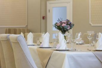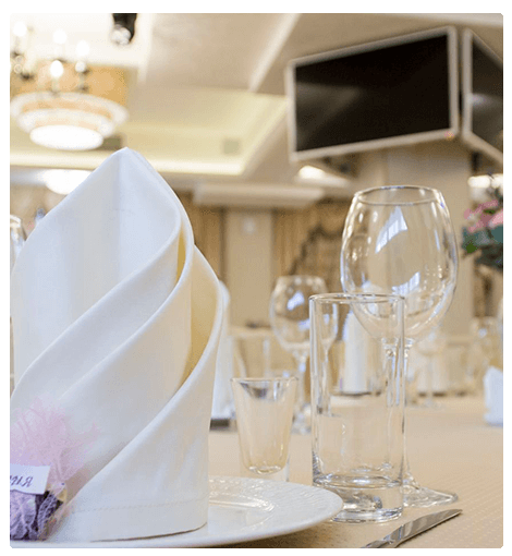 Просторный зал с современным интерьером и оборудованием. В основу стиля легла классика – атласные скатерти цвета шампань, кресла в мягкой обивке и уютный мягкий свет.